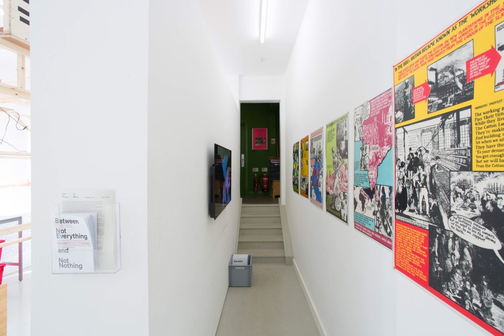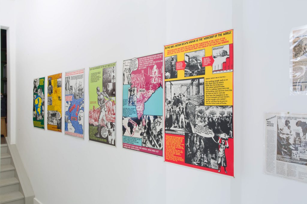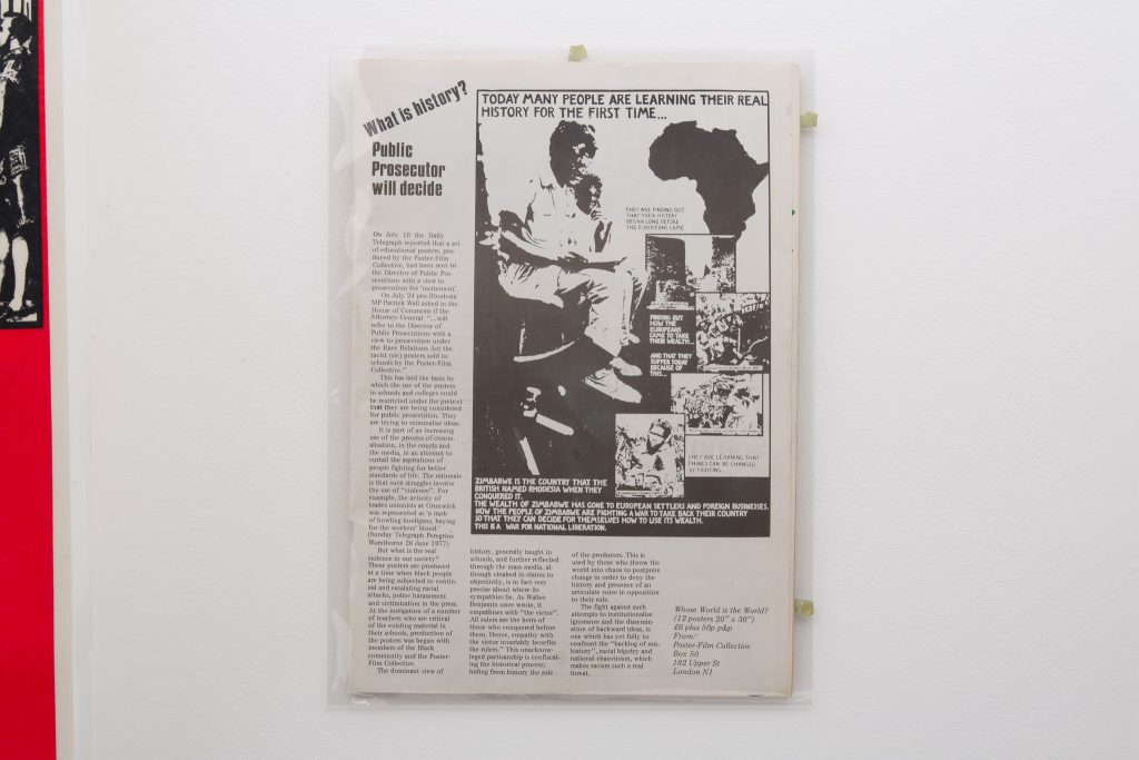 Poster Film Collective were active from 1971 through to the end of the 80s and initially came about through a frustration at the conservatism of the Slade where they had met and shared an interest in how their skills could be put to a more direct political use. The work here Whose World is the World? consists of a set of 12 posters telling the history of colonialism produced by the collective from their workshop in Tolmers Square, Camden and commissioned by the Greater London Council made with schoolteachers to use as a visual aid in order to address what was rapidly becoming a multicultural society. Alongside this is material related to how the Blue Monday Club — a far-right pressure group within the Conservative Party — sought to frustrate the posters distribution via legal means.